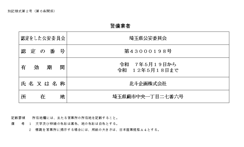 会社概要 2025.11.12 2020.12.17 名称 北斗企画株式会社 所在地 〒335-0004 埼玉県蕨市中央1-27-6 TEL 048-433-5340(代表) FAX 048-443-1304 代表者 代表取締役 細野 恵子 設立年月日 1990年 2月 事業内容 交通誘導警備業務 駐車場警備業務 イベント警備業務 資本金 1,000万円 取引銀行 巣鴨信用金庫戸田支店 城北信用金庫蕨支店 許認可 埼玉県公安委員会認定 第 43000198 号 加盟団体 全国警備業協会/埼玉県警備業協会